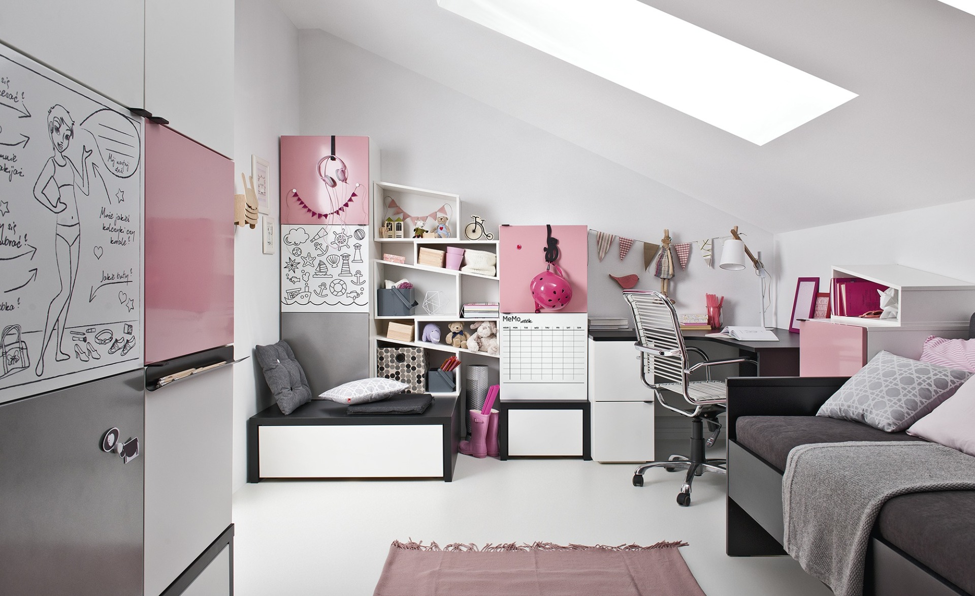 Eindeloos combineren is het sleutelwoord, witte en zwarte basiselementen stapelen en bouwen tot de perfecte jeugdkamer. En dan combineren met leuke accessoires en overlay elementen voor de deurtjes. Partijtje darts, of een handig memobord .you name it, het kan. Wees gewaarschuwd, niet voor klassieke tieners!